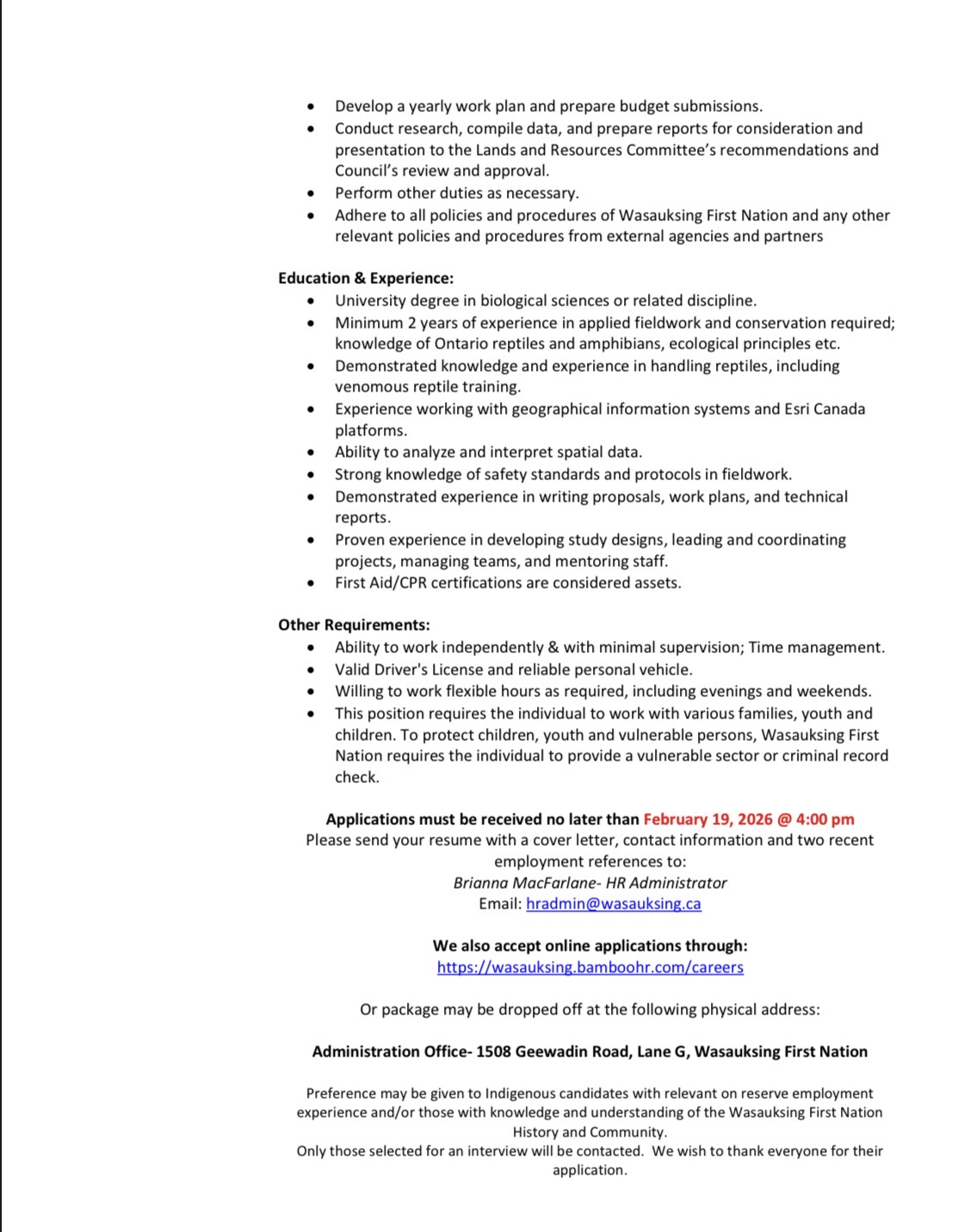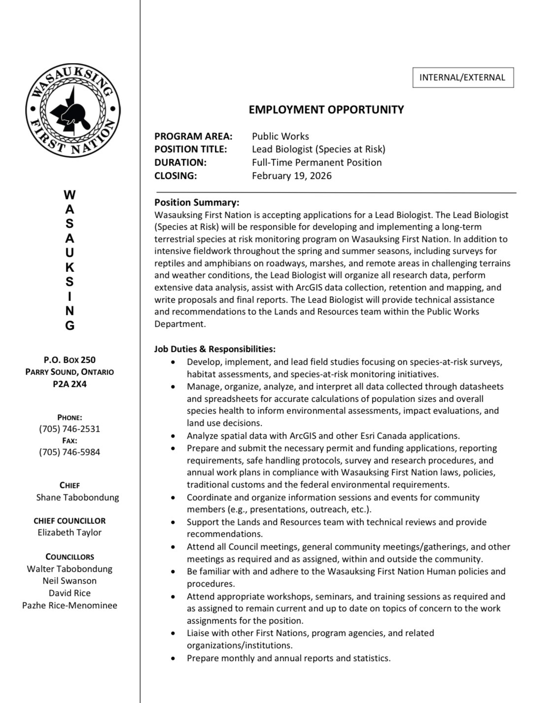 Lead Biologist (Species at Risk) – February 19